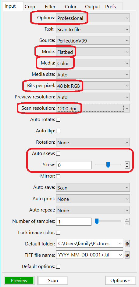 VueScan is a cross-platform scanning program. The Professional version (about $100) adds slide/film scanning, Optical Character Recognition (OCR), and advanced features such as the ability to save raw scan files. This last point is important because we want to archive the data exactly as it comes out of the scanner, before applying any software changes, so that we can reprocess the image later using the original data.